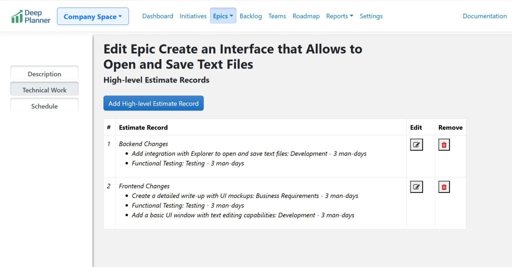 To configure high-level estimates, open the target epic, click ‘Edit’, then select ‘Technical Work’ in the left sidebar.
