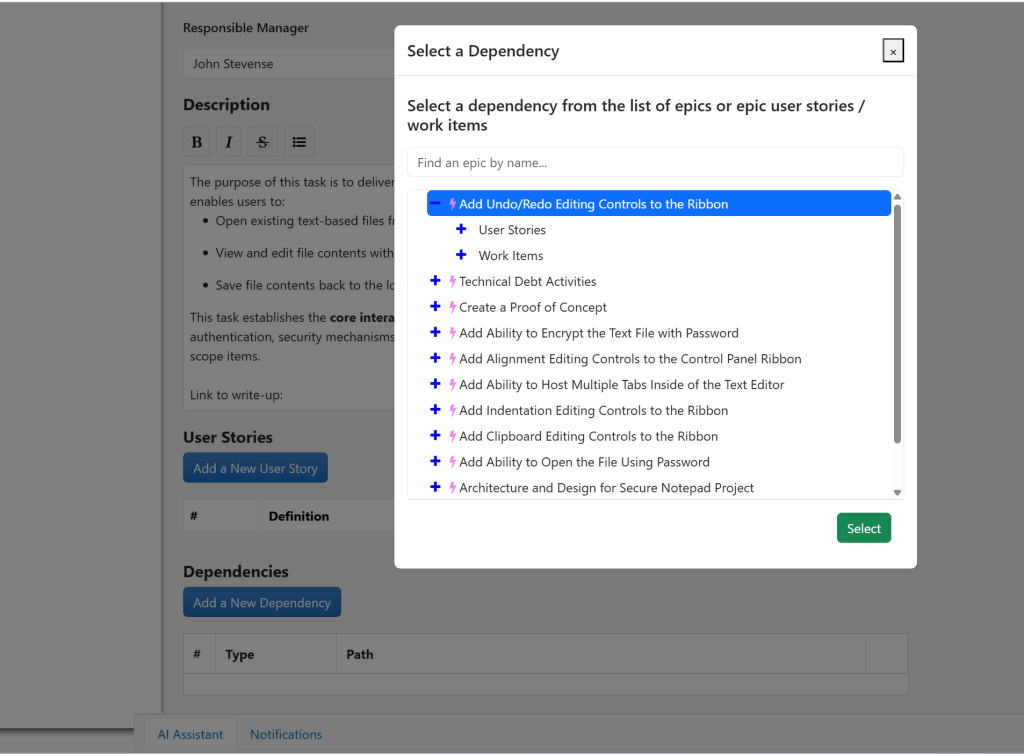 To create or configure user stories, open the target epic and click ‘Edit,’ then find and configure the user stories section.