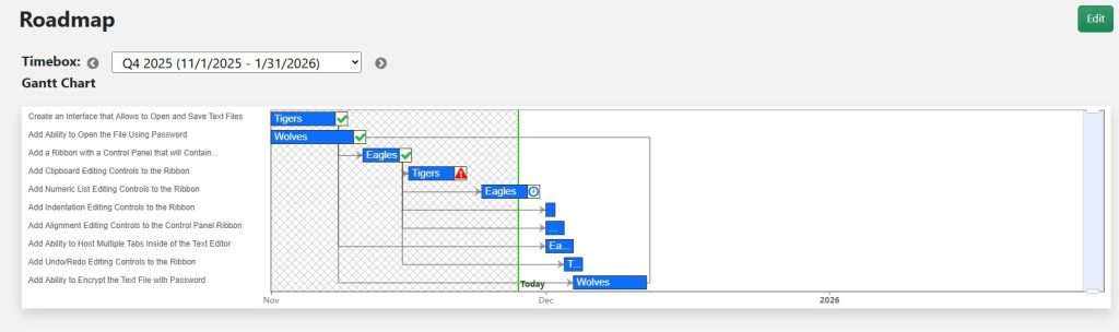 The new timebox will appear in the list of timeboxes for that roadmap and include its name, start date, and end date. You can always navigate between timeboxes by selecting a different one from the list.